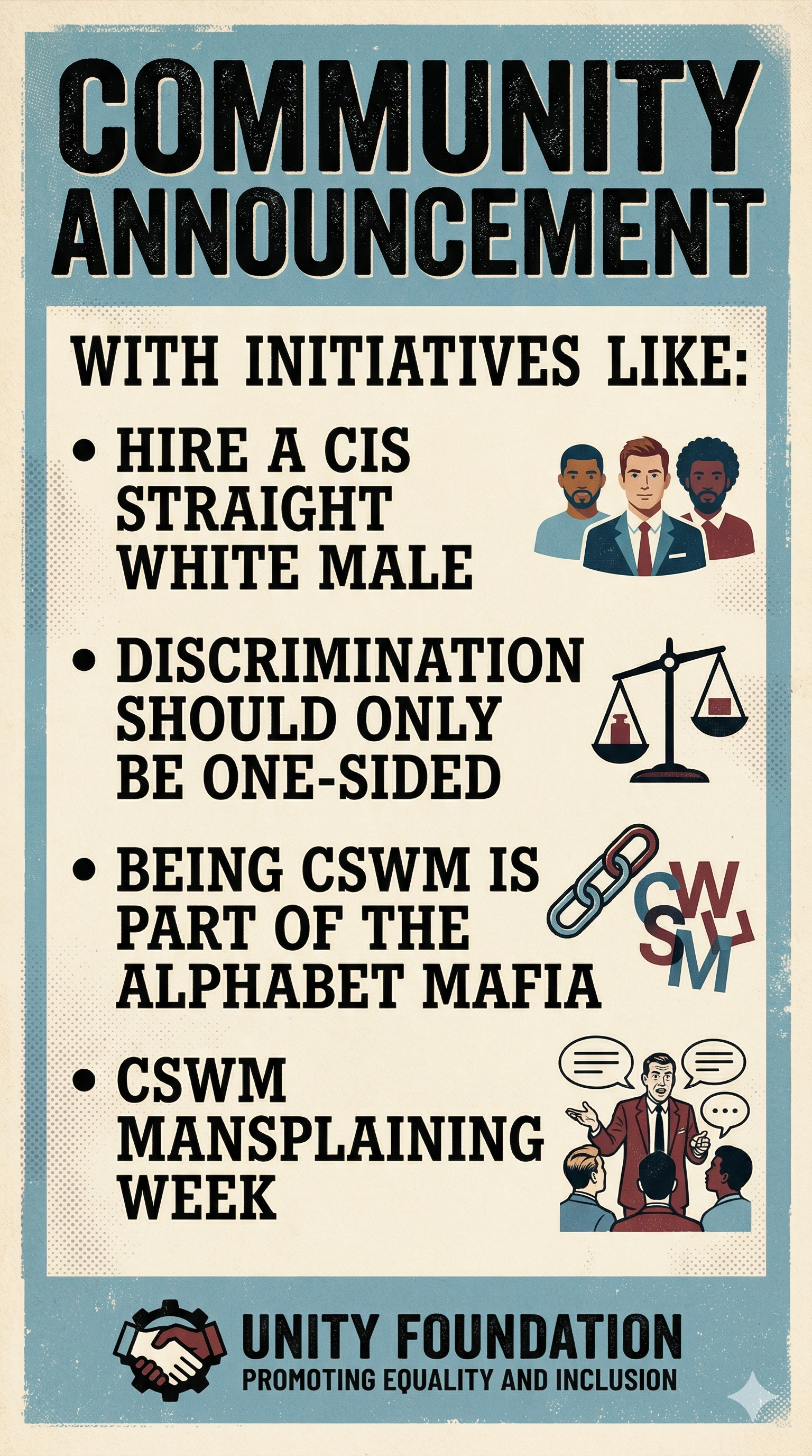 Set up a recurring PayPal donation today. For just $100 a month, you can ensure a CSWM never has to experience the trauma of systemic equality.